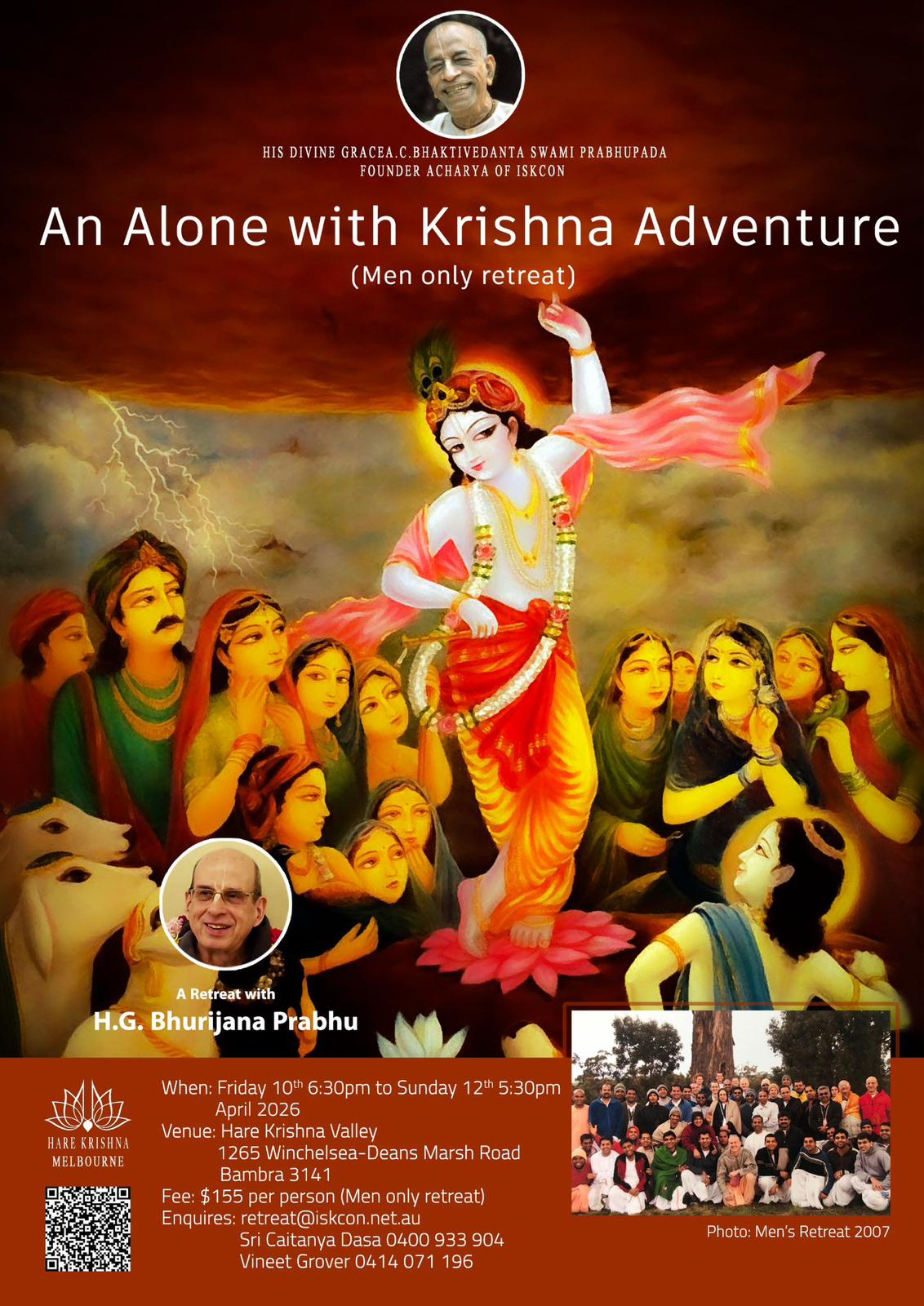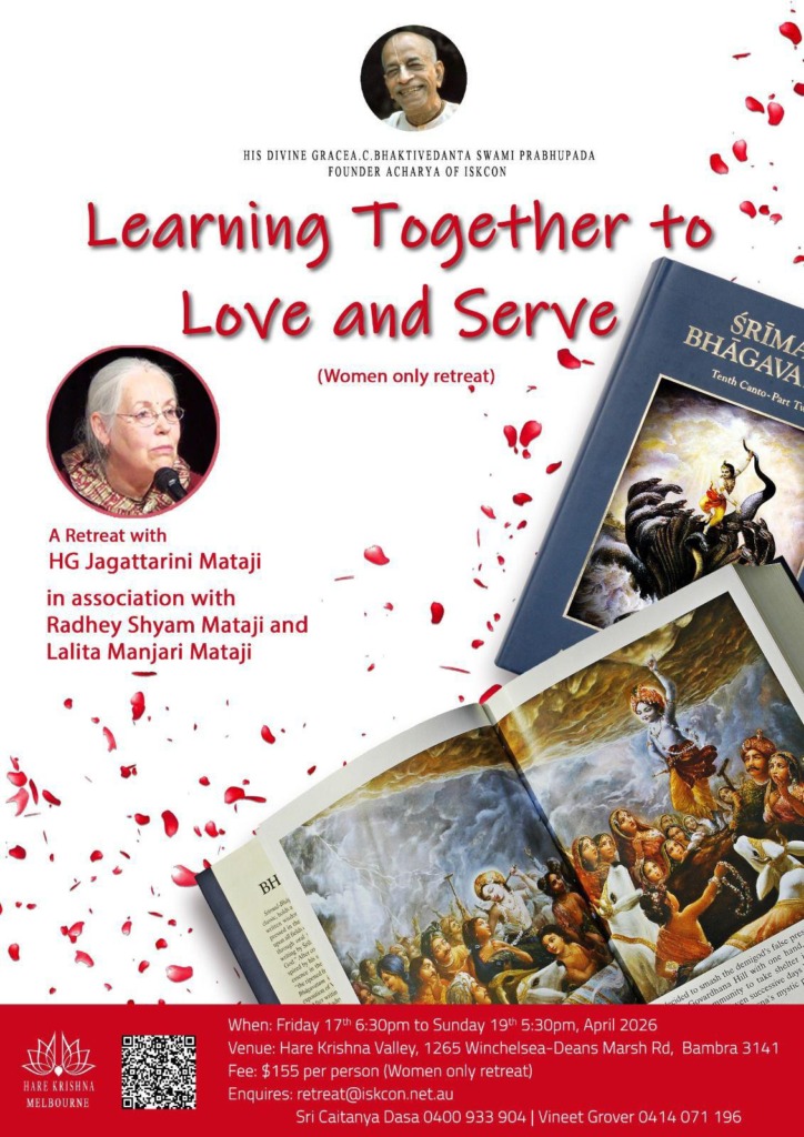 Led by HG Bhurijana Prabhu, this retreat draws from the timeless wisdom of the Bhagavatam and the teachings of His Divine Grace A C Bhaktivedanta Swami Prabhupada. Through dynamic classes, open discussions, chanting, reflection and shared experiences, participants will explore how to cultivate steadiness, responsibility and genuine devotion in modern life.