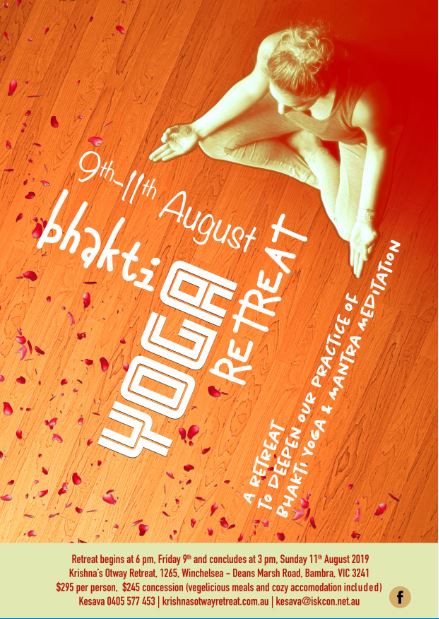 Hare Krishna Valley 1265, Winchelsea – Deans Marsh Road,, Bambra, Victoria, AustraliaKirtan (Mantra Meditation), Spiritual Discussion and a mouth watering Vegan/Vegetarian lunch. Please contact Keshava on 0405 577 453 / 5288 7383 to