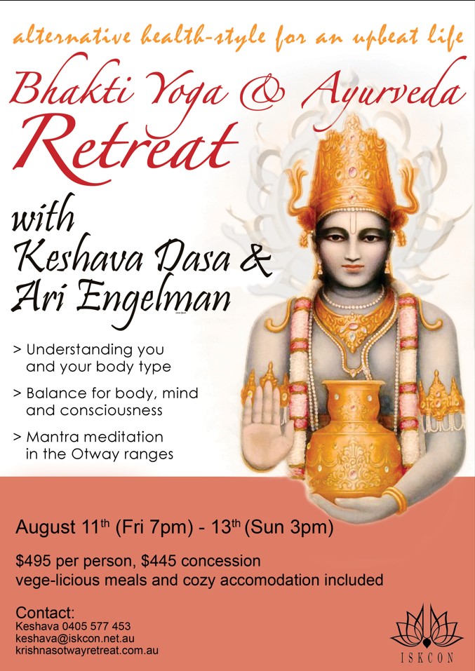 Hare Krishna Valley 1265, Winchelsea – Deans Marsh Road,, Bambra, Victoria, AustraliaKirtan (Mantra Meditation), Spiritual Discussion and a mouth watering Vegan/Vegetarian lunch. Please book your tickets on Eventbrite via our Facebook page. Kids