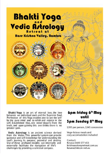 Hare Krishna Valley 1265, Winchelsea – Deans Marsh Road,, Bambra, Victoria, AustraliaKirtan (Mantra Meditation), Spiritual Discussion and a mouth watering Vegan/Vegetarian lunch. Please book your tickets on Eventbrite via our Facebook page. Kids