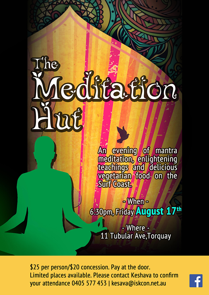 The Meditaion Hut @ Torquay 11 Tubular Ave, Torquay, Victoria, AustraliaAn evening of mantra meditation, enlightening teachings and delicious vegetarian food on the Surf Coast. 6:30pm, Friday Jan 26th at 11 Tubular